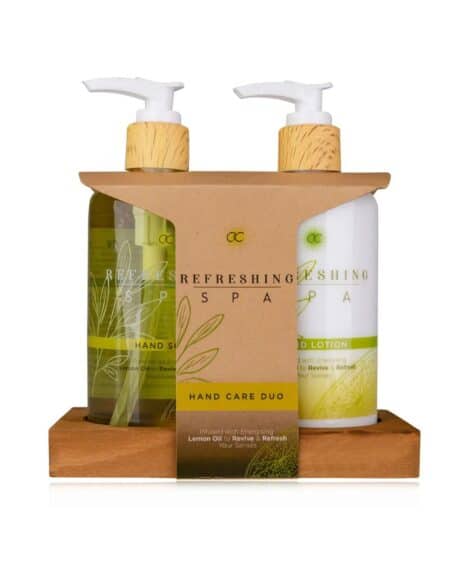 Set per la cura delle mani REFRESHING SPA su vassoio di legno, incl. sapone per mani da 290 ml e lozione per mani da 290 ml in dispenser a pompa, arricchito con olio di limone, fragranza: Limone & Gelsomino, colore: verde/giallo/marrone, VE 6