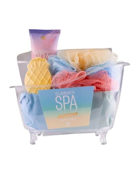 Set da bagno SUMMER SPA in una mini vasca decorativa, ideale per rilassanti momenti di benessere. Contiene: – 60 ml di scrub doccia per rinnovare delicatamente la pelle, – 40 g di vaporizzatore doccia per godersi il vapore aromatico, – 40 g di spugna a rete per una schiuma rinfrescante. Fragranza: Summer Sensations – un sogno estivo per il corpo e i sensi!