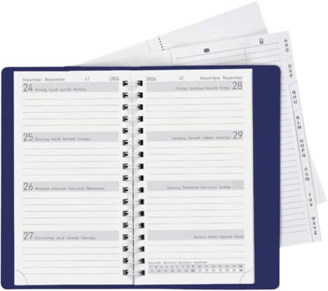 Questa agenda settimanale sostitutiva Biella è ideale per uso privato. La nostra agenda settimanale con 1 settimana per pagina è pratica, sta in ogni tasca, per il modello Bruxelles Wire-O e mostra i vostri appuntamenti settimanali con un solo sguardo.