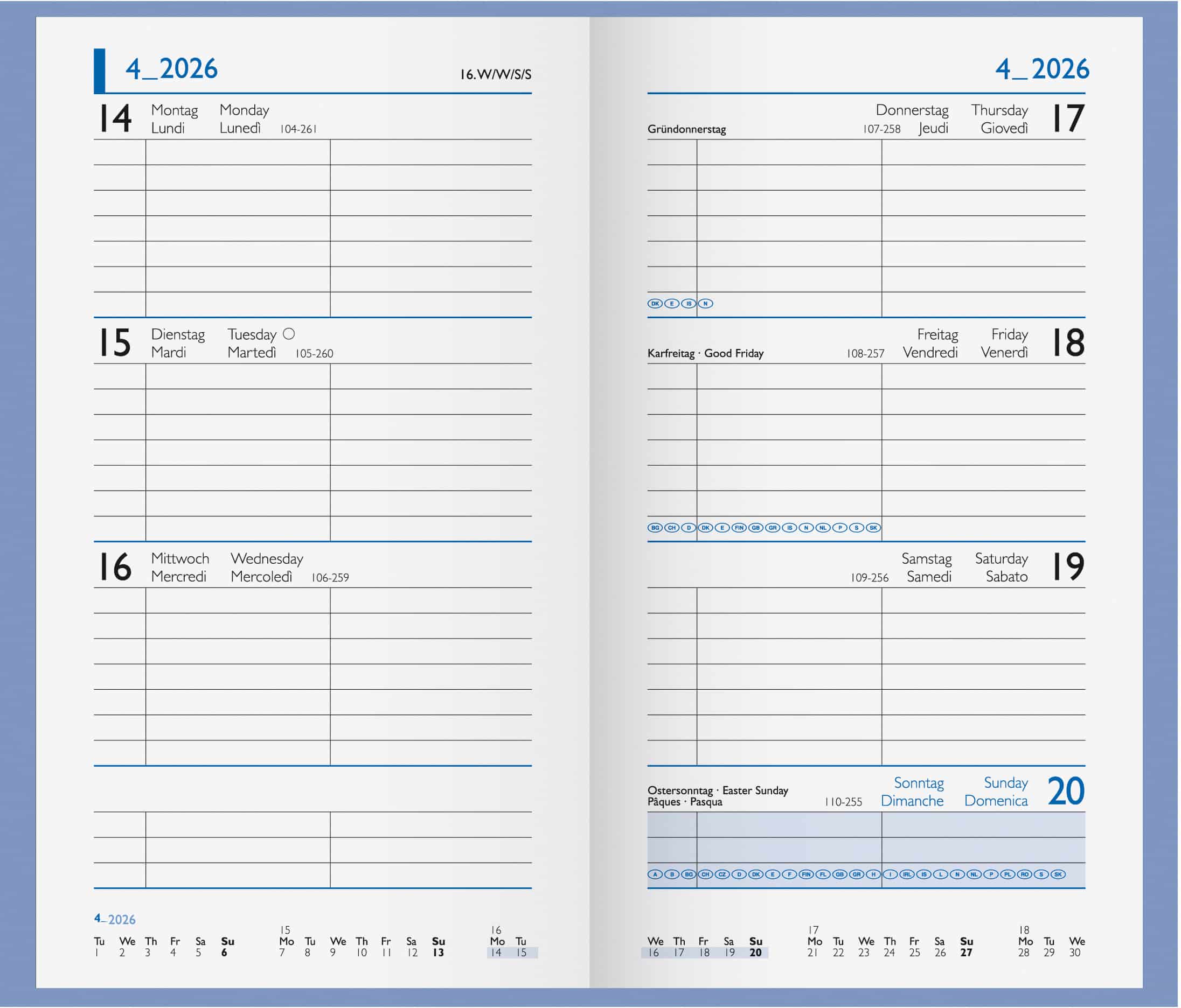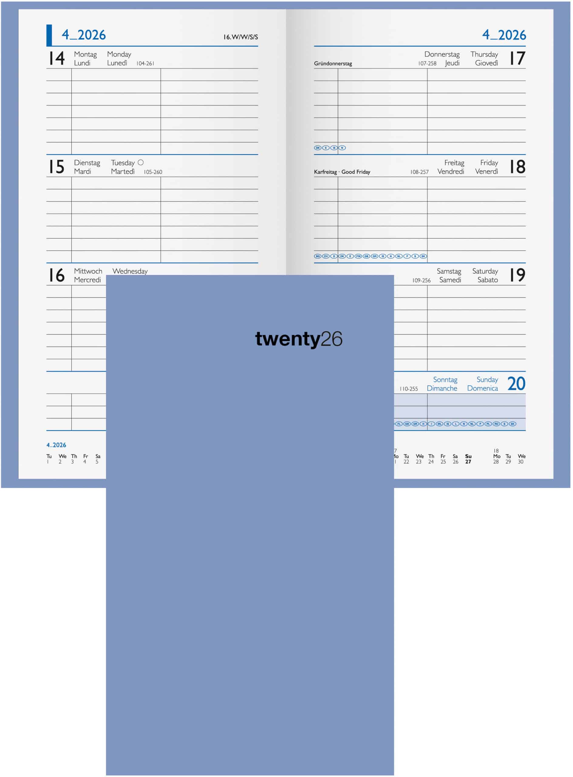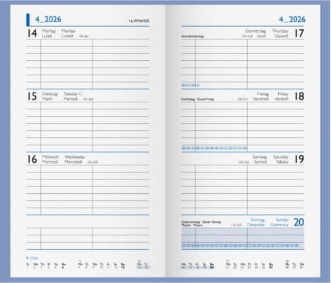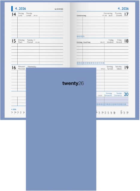 L'agenda tascabile colorata è ideale per uso personale. L'agenda tascabile con 1 settimana per pagina è pratica, sta in qualsiasi tasca e offre una panoramica degli appuntamenti settimanali.