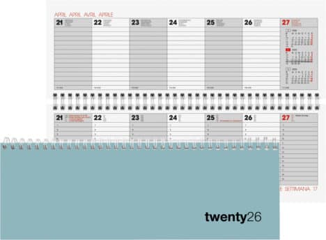 L'agenda da tavolo Biella è facile da aprire grazie alla rilegatura a spirale e contiene il calendario di 1 settimana su due pagine. Con una panoramica mensile, uno scadenzario e campi per le note, l'agenda da scrivania offre molto spazio per scrivere, pur rimanendo compatta e pratica.
