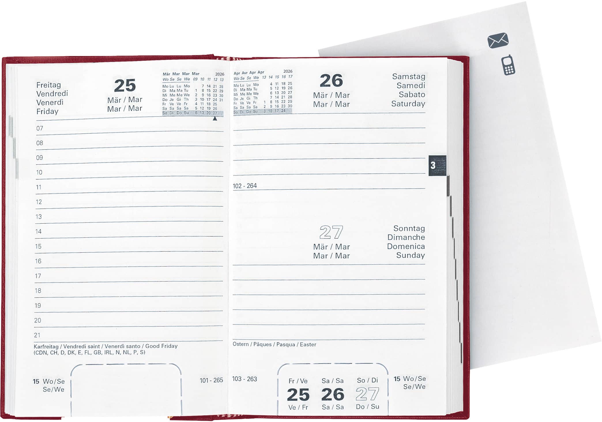 - Ogni pagina con panoramica mensile e stampa del registro e perforazione d'angolo