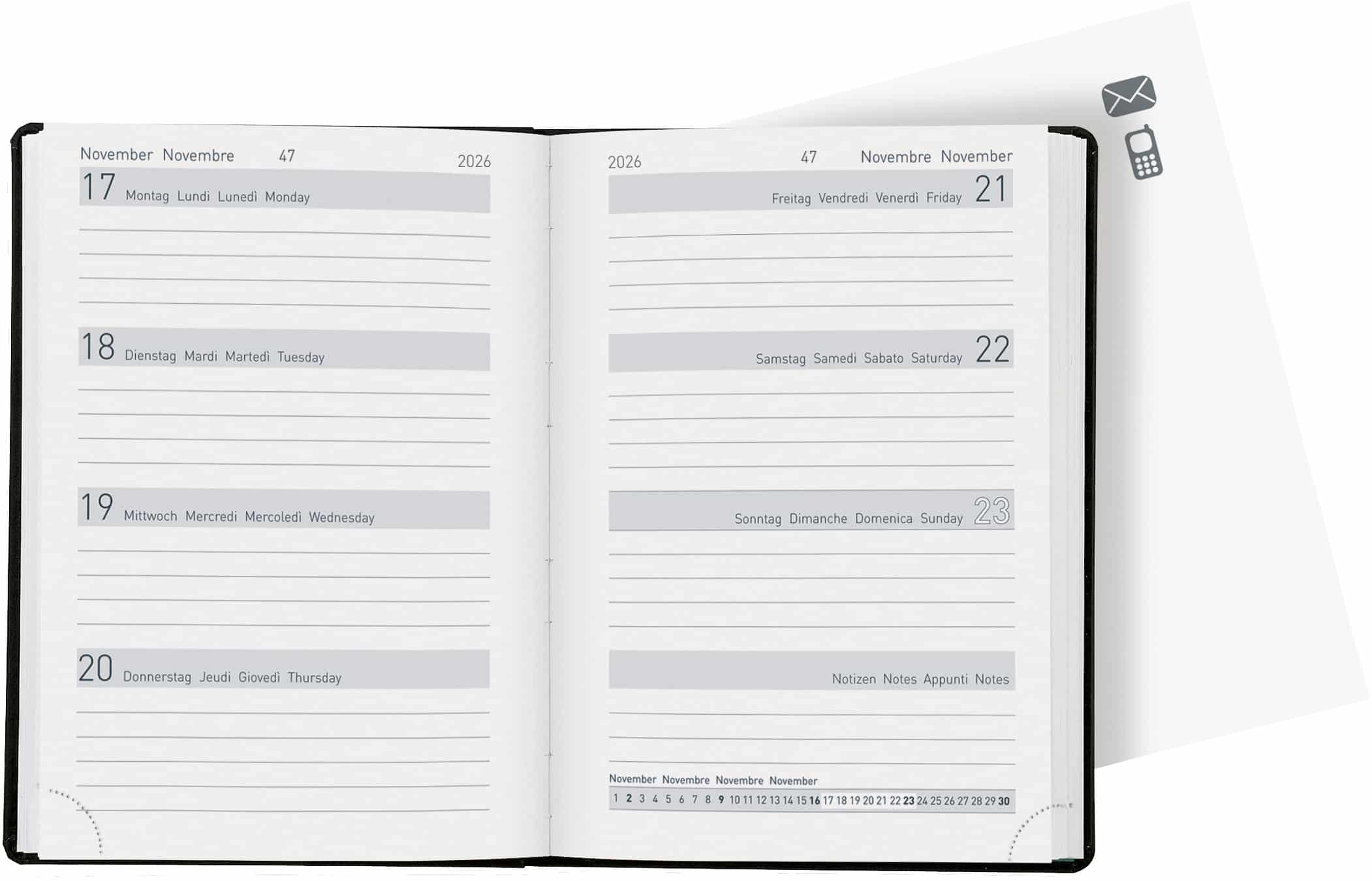 L'agenda tascabile Biella è ideale per l'uso personale. La nostra agenda tascabile con 1 settimana su 2 pagine è pratica, sta in ogni tasca e offre una panoramica degli appuntamenti settimanali. Copertina in similpelle colorata e marmorizzata. Stampa grigia, aspetto bicolore. Ogni pagina ha una panoramica mensile, un campo note e una perforazione angolare. Inoltre, 16 pagine di note blanco altamente perforate e 32 pagine di registro indirizzi intercambiabili.