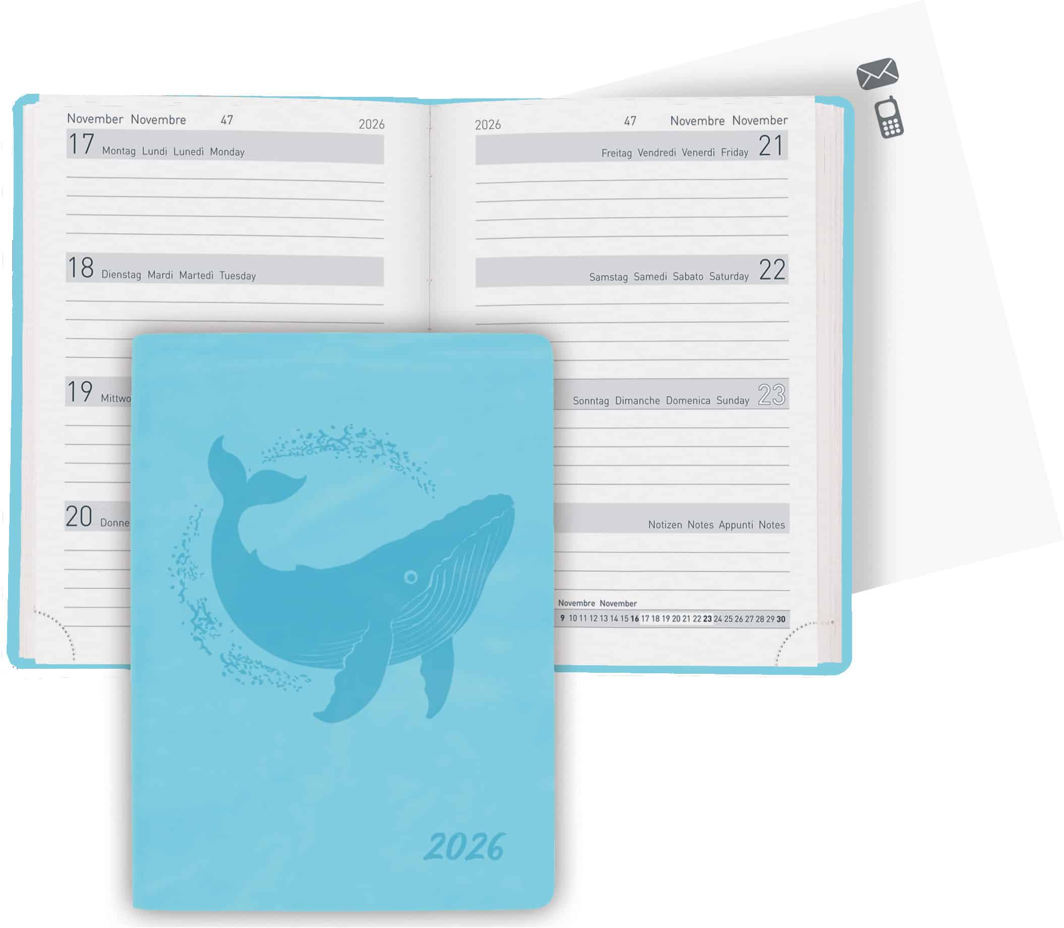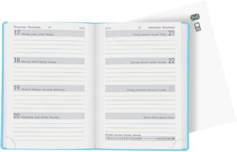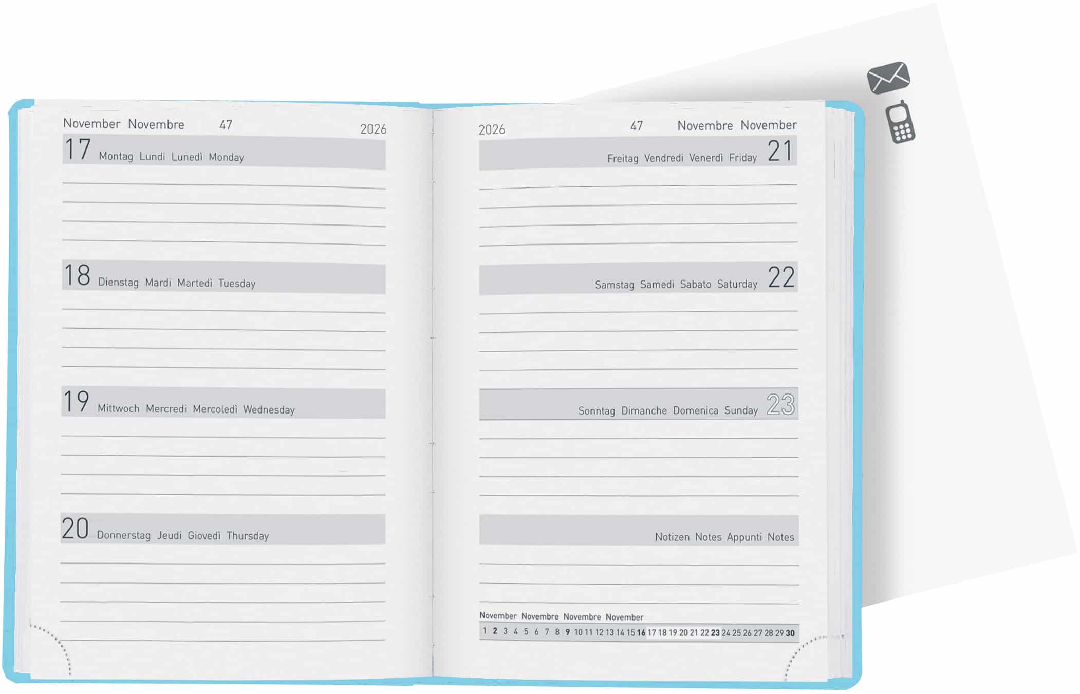 L'agenda tascabile Biella è ideale per l'uso personale. La nostra agenda tascabile con 1 settimana per pagina è pratica, sta in ogni tasca e offre una panoramica degli appuntamenti settimanali.