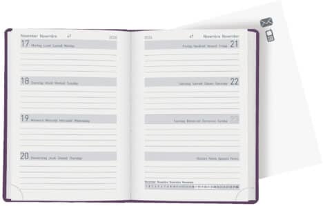 L'agenda tascabile Biella è ideale per l'uso personale. La nostra agenda tascabile con 1 settimana per pagina è pratica, sta in ogni tasca e offre una panoramica degli appuntamenti settimanali.