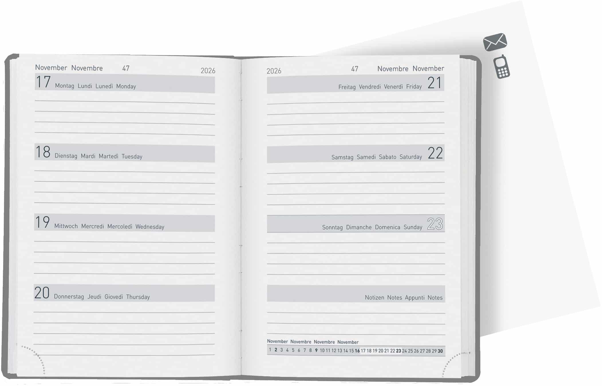 L'agenda tascabile Biella è ideale per l'uso personale. La nostra agenda tascabile con 1 settimana per pagina è pratica, sta in ogni tasca e offre una panoramica degli appuntamenti settimanali.