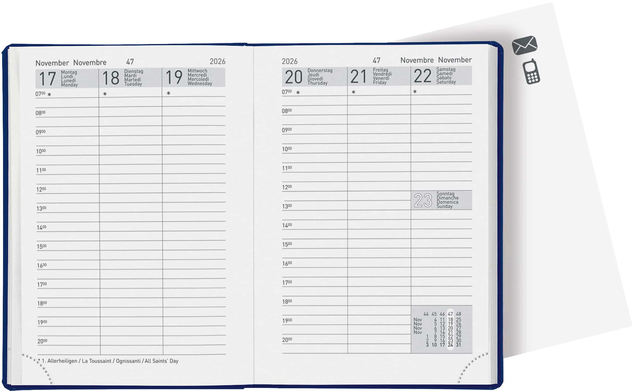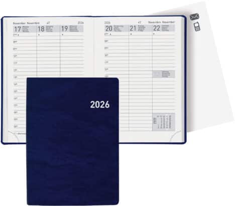 L'agenda tascabile Biella è ideale per l'uso privato. La nostra agenda tascabile con 1 settimana su due pagine è pratica, sta in ogni tasca e offre precisione nella pianificazione grazie alla divisione in ore.
