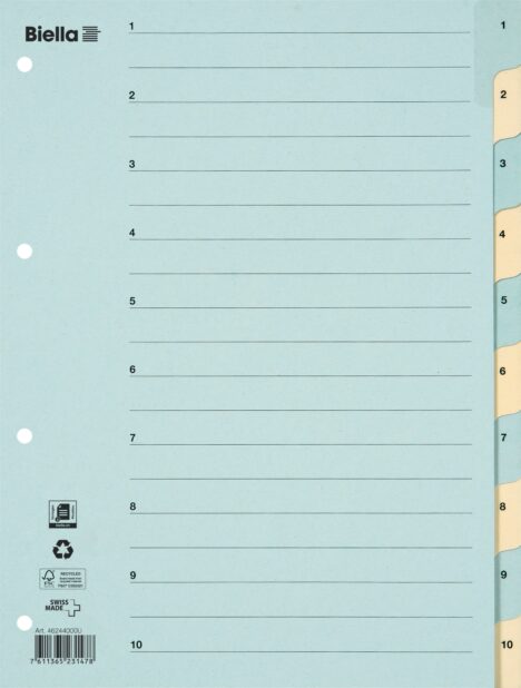 Organizzate i vostri documenti in modo rapido ed efficiente con i pratici indici di Biella. Le linguette colorate e l'indice iscrivibile individualmente consentono di trovare rapidamente i documenti. Linguette rinforzate per un uso particolarmente frequente.