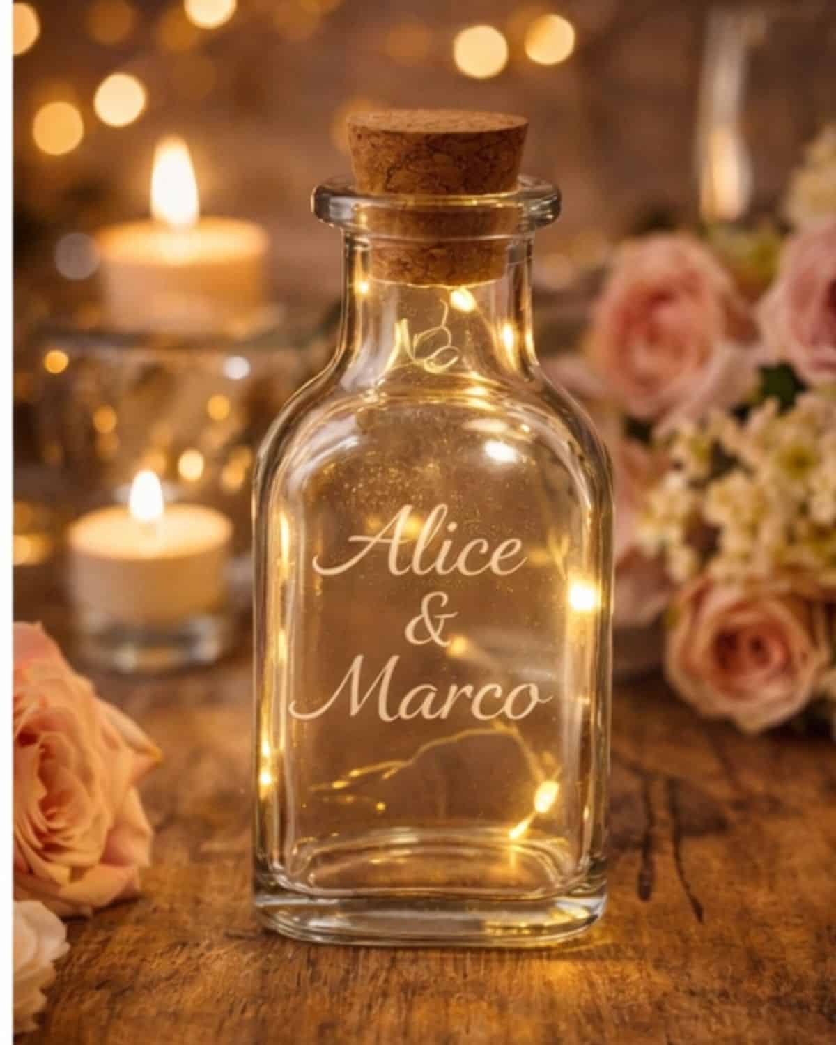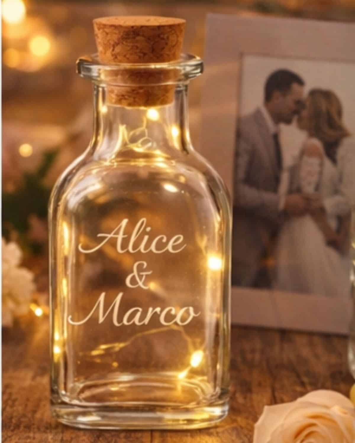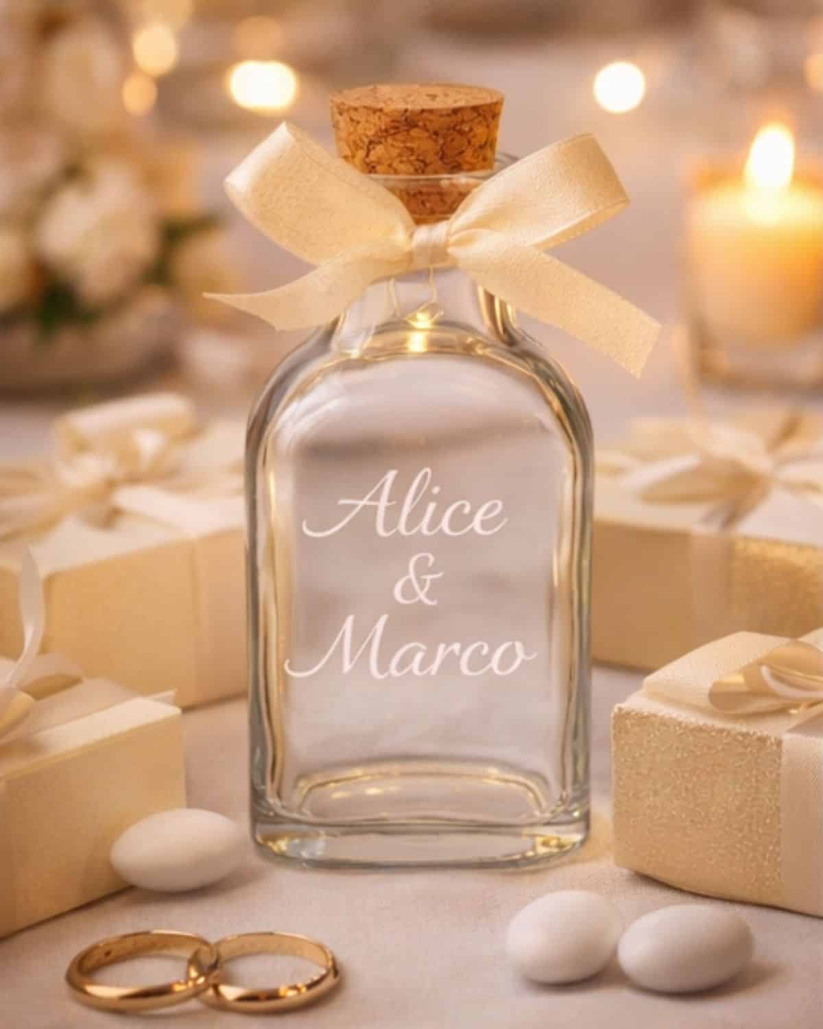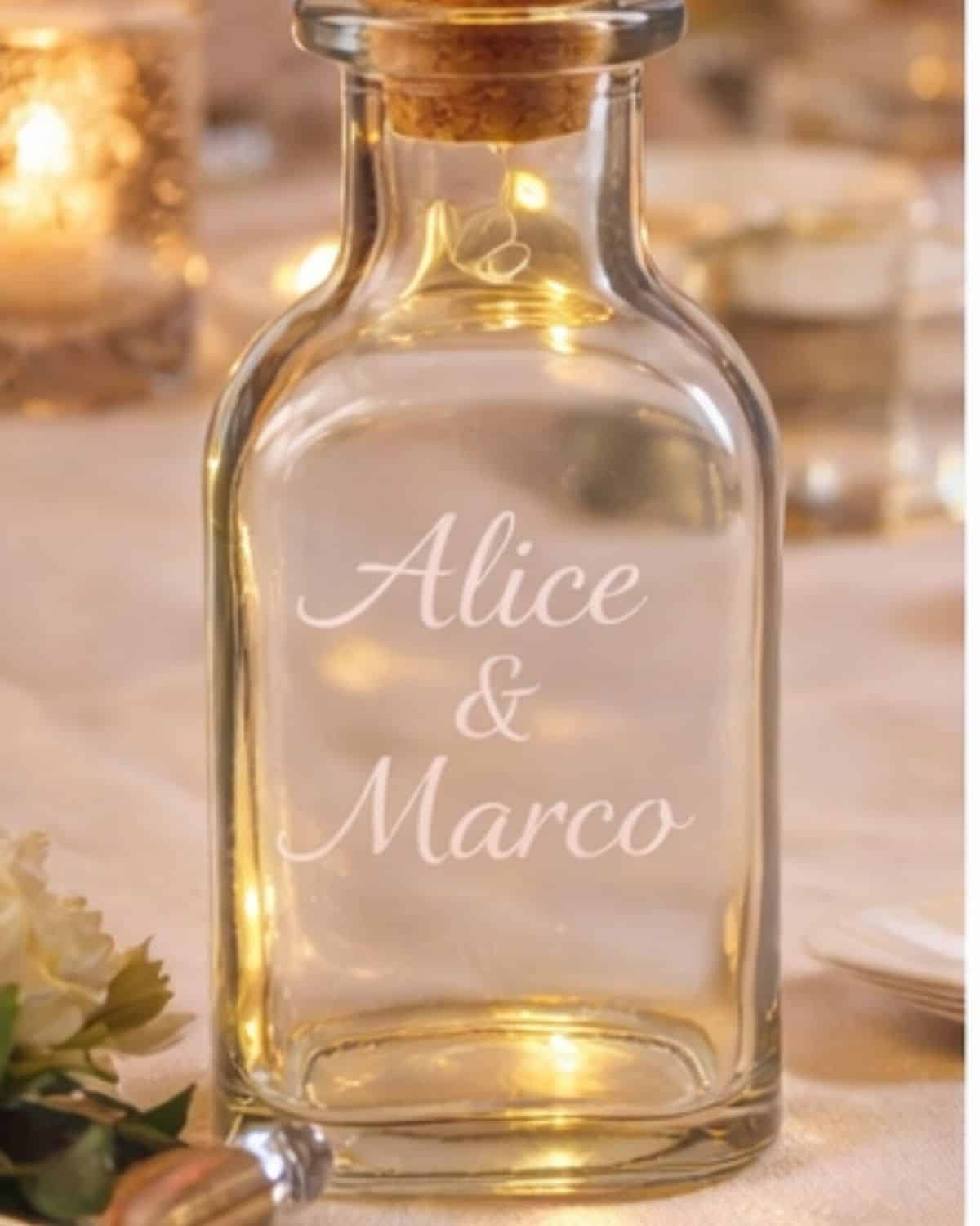 Rendi la tua bottiglia davvero unica con la personalizzazione incisa al laser. Puoi aggiungere nomi, loghi, frasi o dediche speciali, trasformandola in un oggetto esclusivo, ideale come regalo personalizzato o bomboniera elegante.