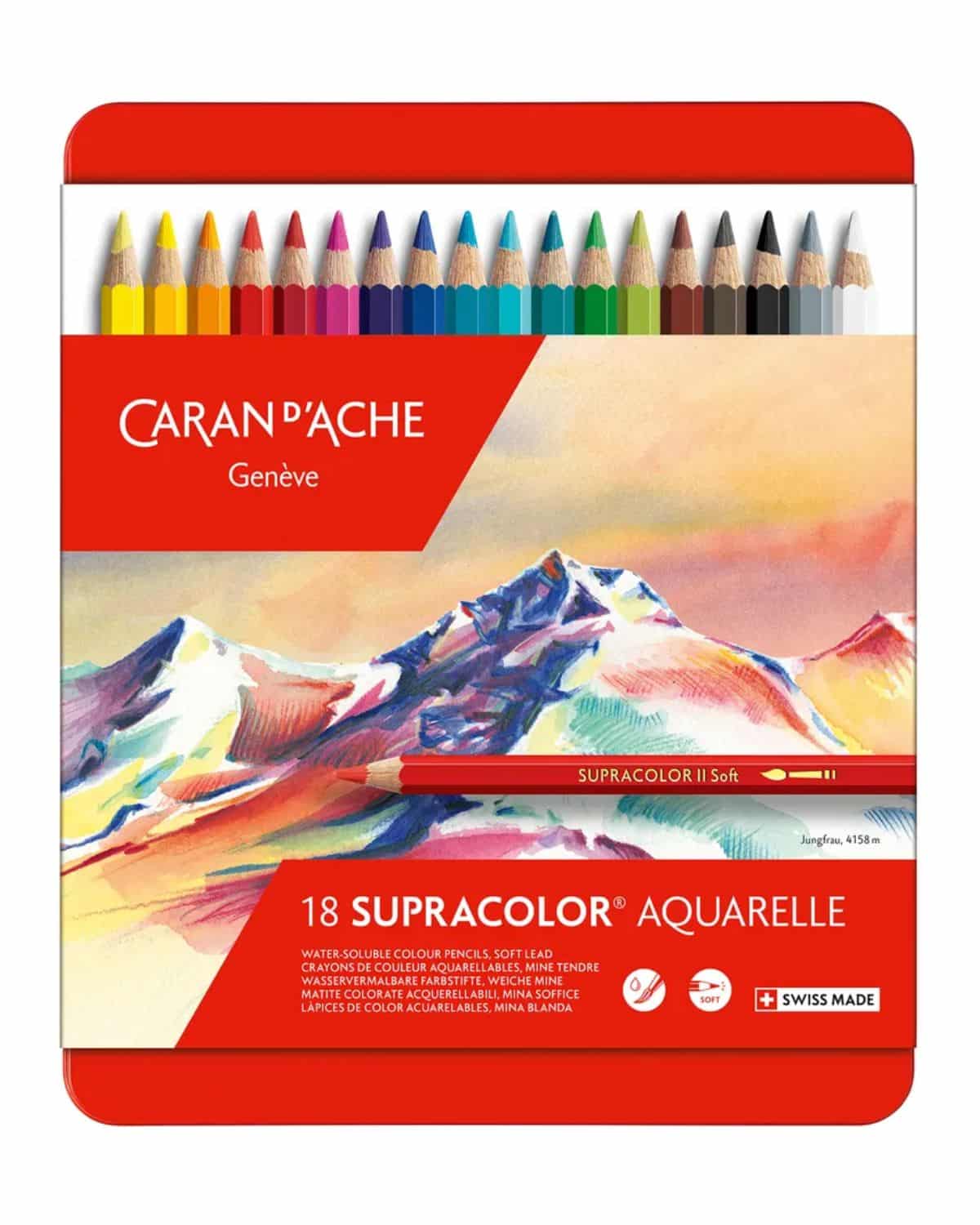 Le matite colorate acquerellabili CARAN DโACHE Supracolor Soft sono un punto di riferimento per artisti professionisti, illustratori, grafici, studenti e insegnanti di disegno. Questo set da 18 pezzi offre una selezione armoniosa di colori brillanti, pensata per garantire risultati eccellenti sia nellโuso asciutto che bagnato.