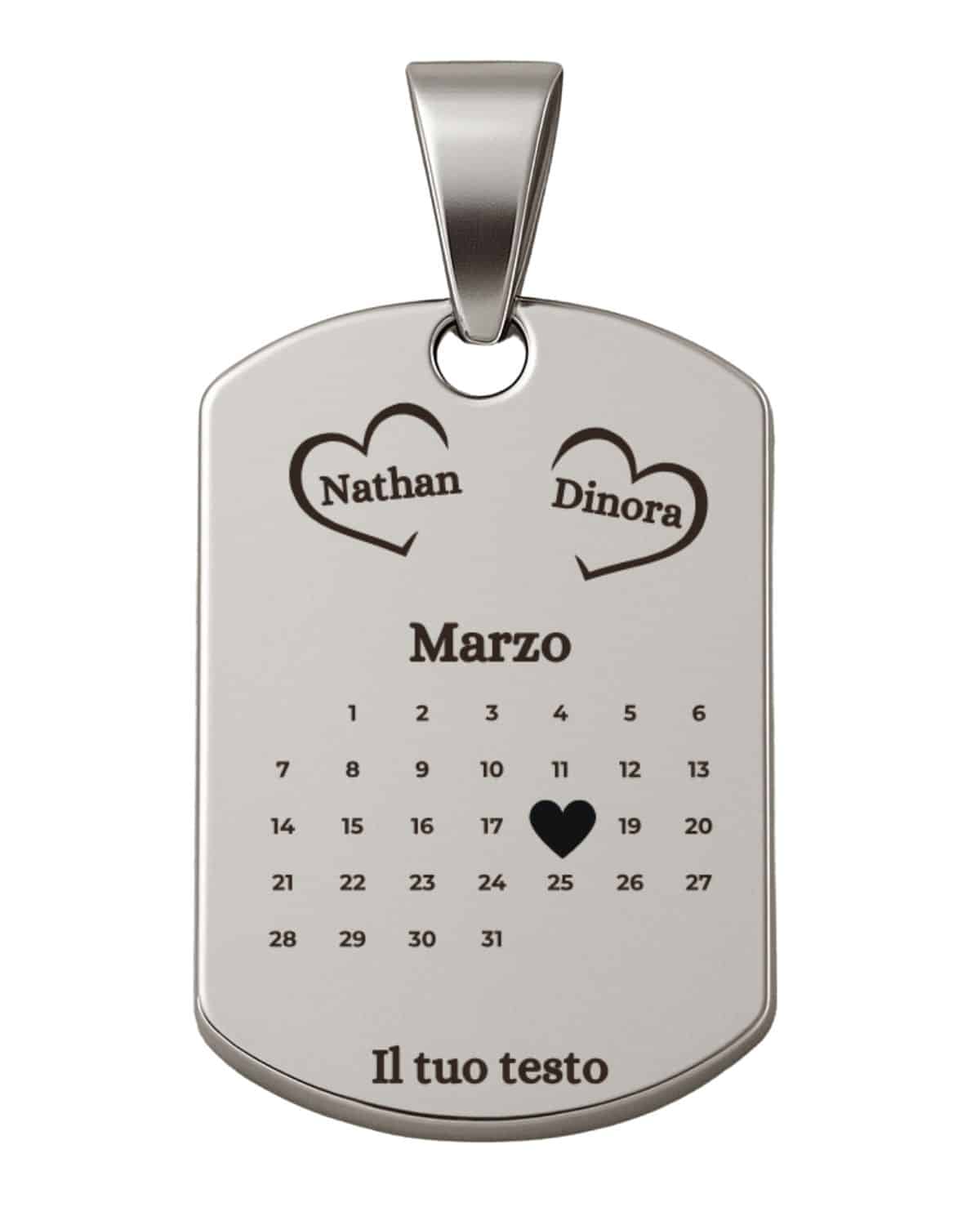 Il ciondolo presenta un calendario del mese scelto con il giorno evidenziato da un cuore inciso. Puoi aggiungere: