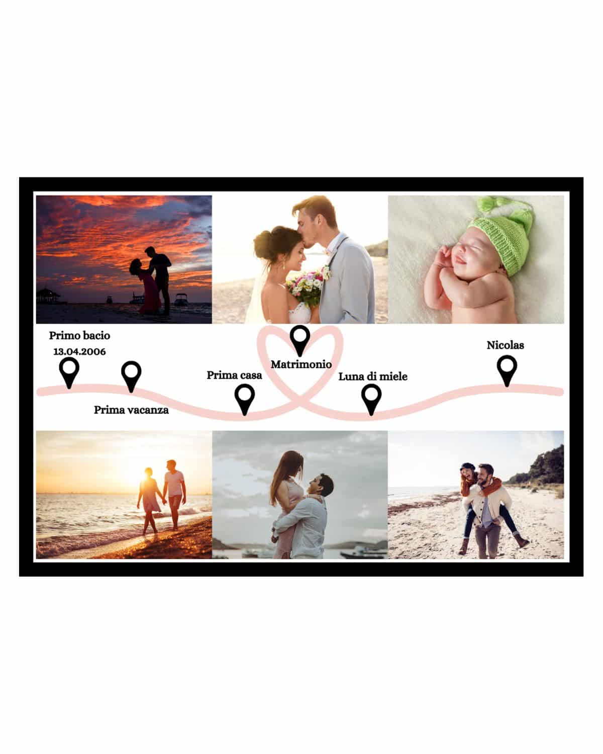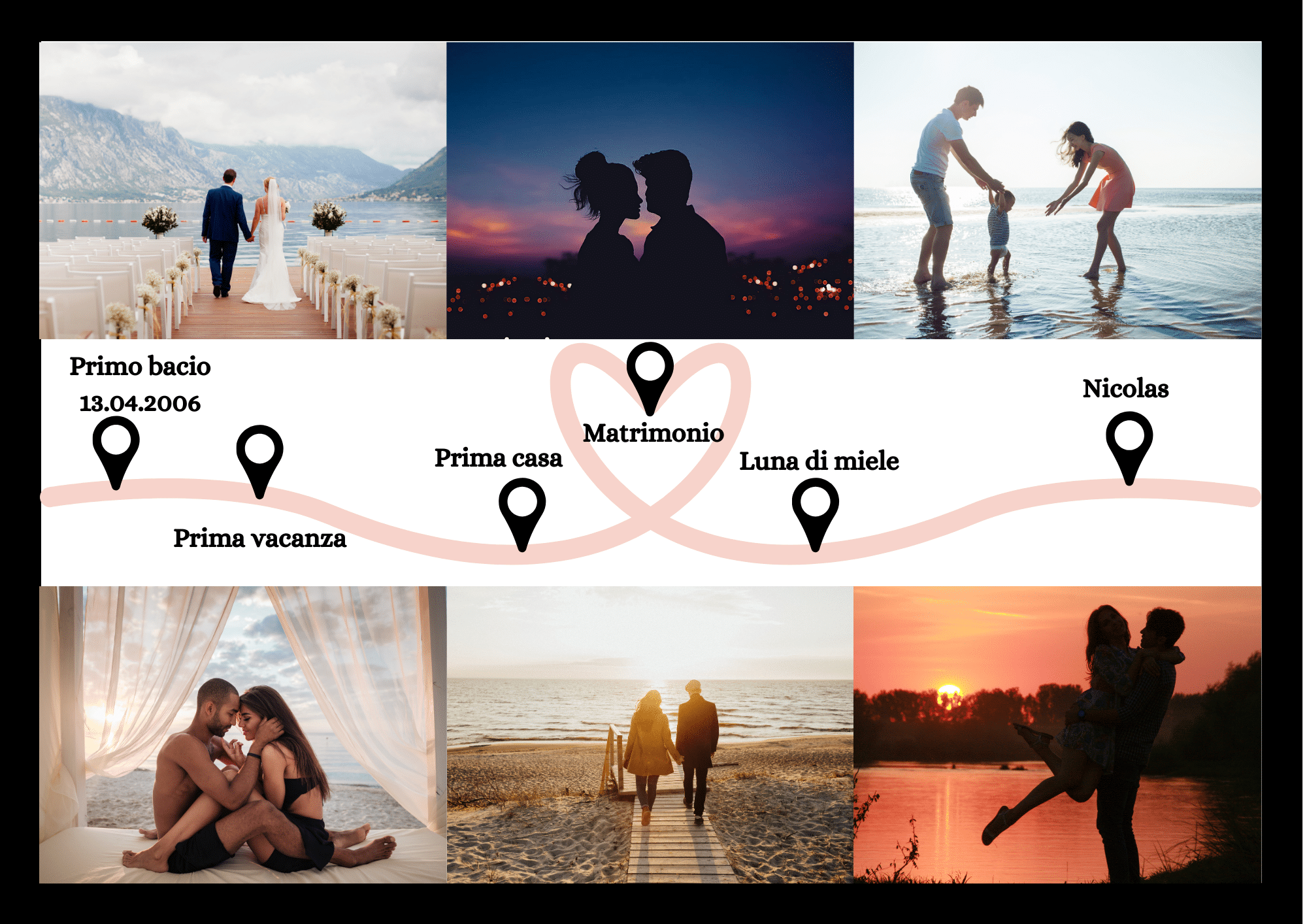 Puoi scegliere tra due layout esclusivi, che ti permettono di aggiungere foto, date e didascalie personalizzate per ogni fase importante della tua relazione. Dal primo incontro, al primo bacio, passando per vacanze, matrimonio, anniversari e persino la nascita dei figli, potrai raccontare la tua storia d’amore passo dopo passo.