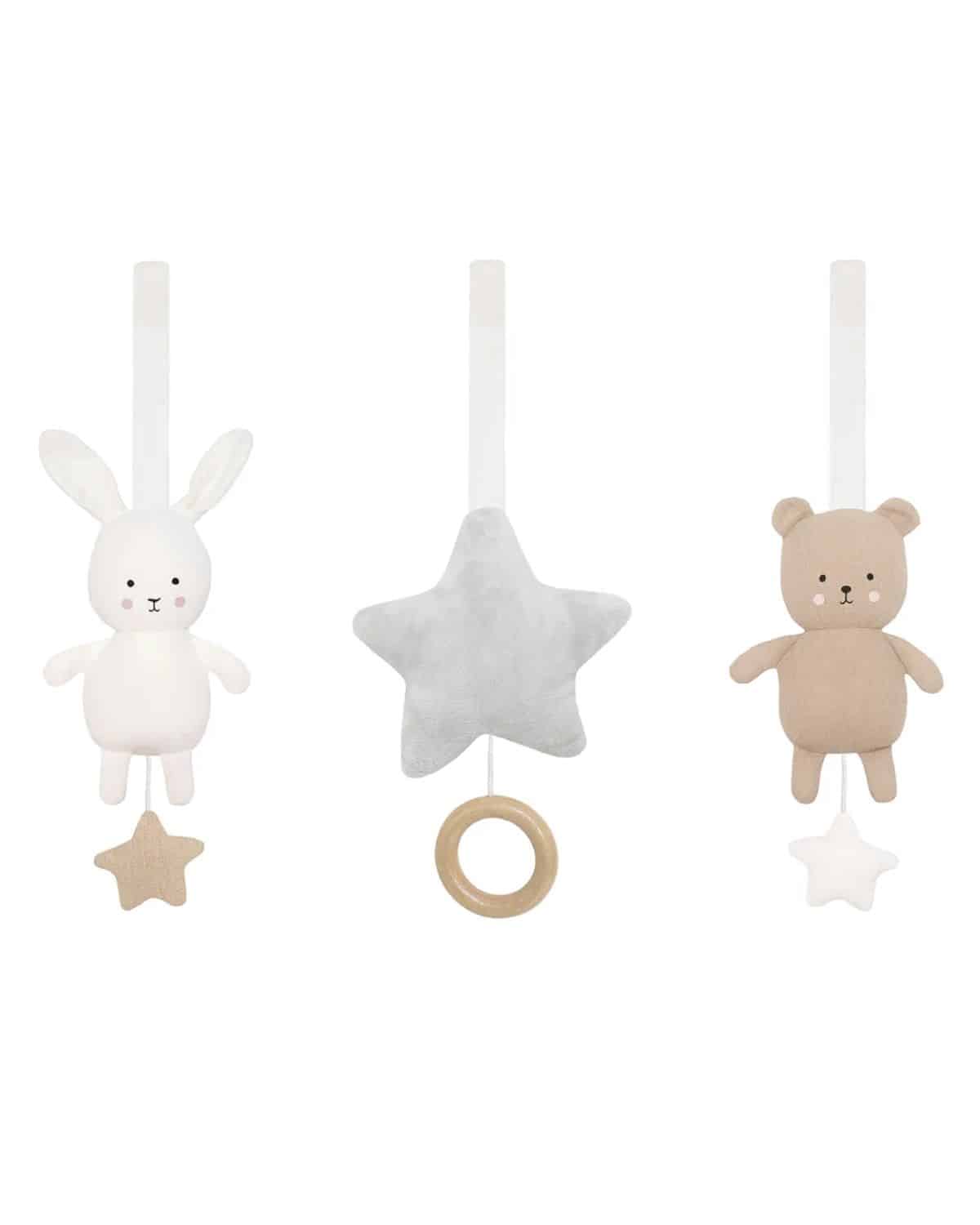Simpatici e morbidi giochi da palestra per bambini, tra cui una stella, un coniglio e un orsacchiotto. La stella suona una ninna nanna. Le forme e i colori invitanti faranno divertire il bambino e stimoleranno lo sviluppo delle capacità visive e motorie. I giochi sono dotati di lunghe asole per essere facilmente agganciati alla palestrina o alla maggior parte dei lettini e delle culle per divertirsi anche in viaggio. Lavabile a mano.