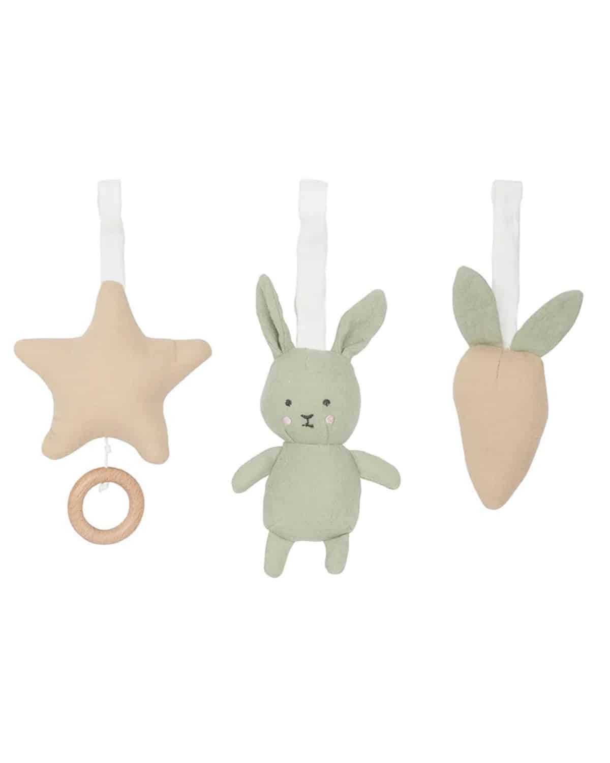 Simpatiche figure di Baby Gym in tessuto di Jabadabado, con i personaggi del coniglietto, della stella e della carota. Le figure della Baby Gym sono attaccate alla palestra per bambini con chiusure in velcro e possono quindi essere facilmente attaccate in diversi punti. La stella è un carillon che suona una ninna nanna (Brahms Lullaby) e la carota ha un sonaglio all’interno che emette un suono quando il bambino la tocca. Le forme e i colori interessanti delle figure faranno divertire il bambino per ore. Da abbinare alla palestrina in legno Jabadabado.