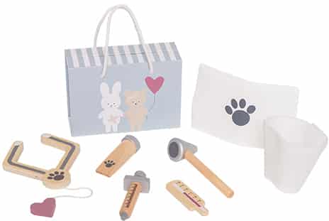 Siete pronti ad aprire il vostro ambulatorio veterinario? Questa borsa da veterinario attrezzata con chiusura magnetica di Jabadabado ha tutti gli strumenti in legno adatti a salvare i vostri amati animali e peluche in difficoltà. Ascoltate il loro cuore con lo stetoscopio, misurate la temperatura con il termometro o somministrate le vaccinazioni con la siringa e assicuratevi che i vostri animali ricevano le cure migliori. Questa borsa ricca di contenuti è perfetta per il gioco immaginativo e per far apprendere ai bambini il concetto di cura ed empatia. La borsa è ideale anche per i giochi di ruolo.