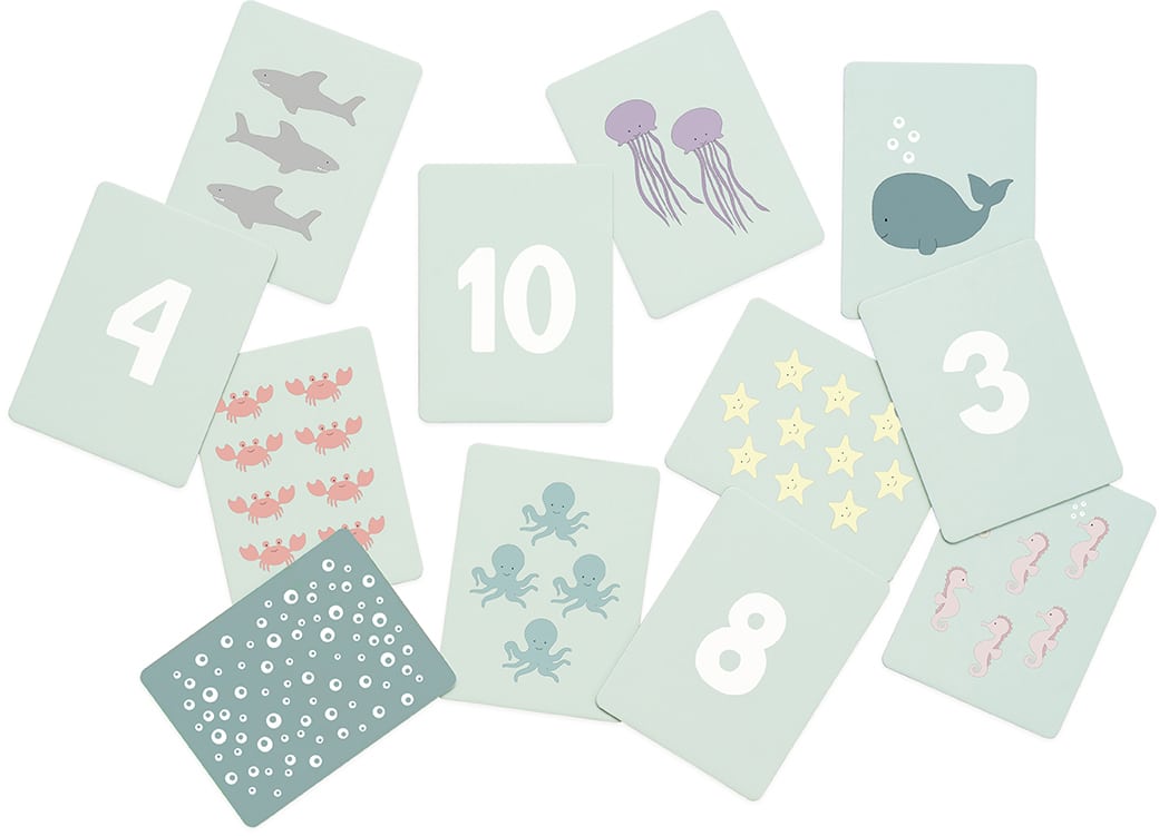 Trova motivi e numeri in modo divertente! Il gioco Jabadabado memo con motivi marini è facile e divertente da giocare in famiglia o con gli amici. Le 20 carte rettangolari sono decorate con vari motivi ispirati al mare. Abbinate le carte numerate al numero corretto di creature marine, con l'obiettivo di abbinare 10 coppie. Mettete tutte le carte a faccia in giù e poi giratele due alla volta. Avete trovato una coppia corrispondente? Congratulazioni, allora potrete girare altre due carte. Ma questa volta non c'è stata corrispondenza? Allora la fortuna va al vostro avversario. Vince il giocatore con il maggior numero di coppie corrispondenti. Memo può essere giocato individualmente o in coppia e allena, tra le altre cose, l'attenzione, la concentrazione e la capacità di aspettare il proprio turno. Questo gioco di memo è anche un modo fantastico e divertente per i bambini di imparare i numeri e i semplici conteggi. Che vinca il miglior giocatore!