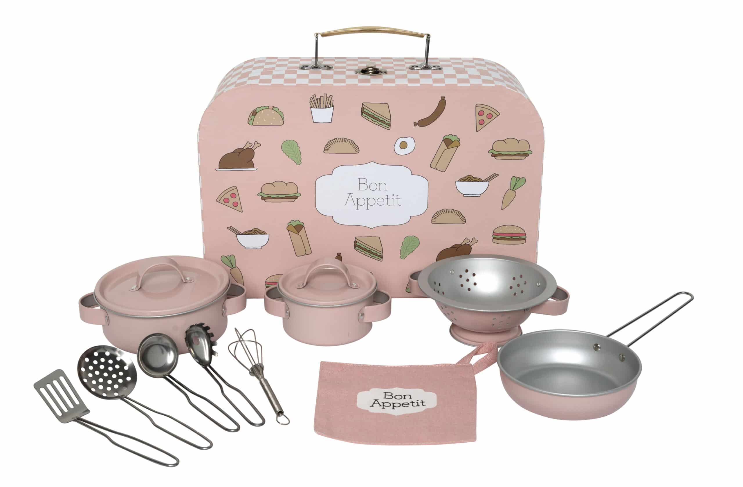 Un set da cucina che non lascia nulla a desiderare per il piccolo chef. La valigetta può essere capovolta e utilizzata come piano cottura. Il set comprende 13 oggetti che possono essere utilizzati anche per aiutare nella cucina reale.