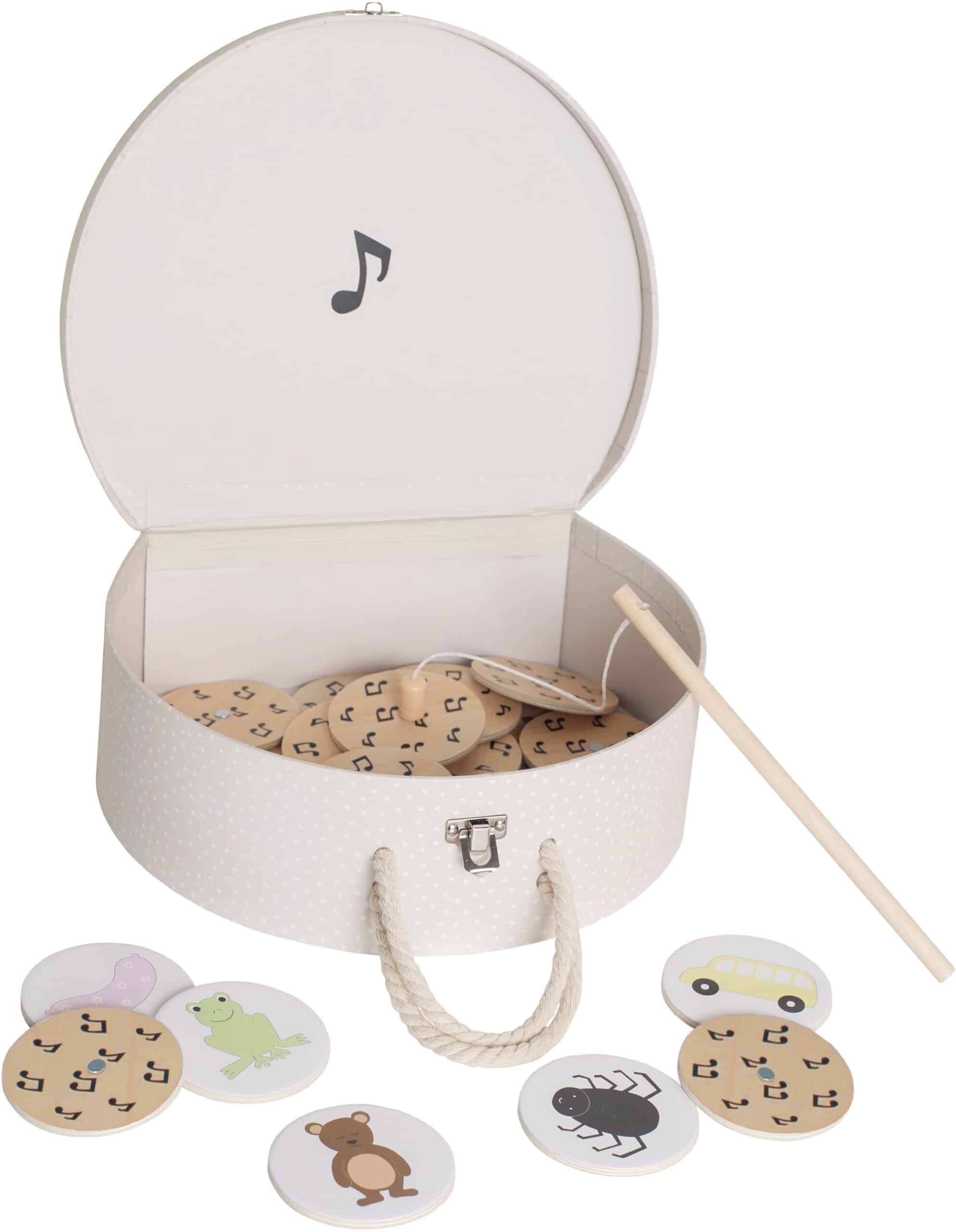Concedetevi un momento di intimità insieme con questa divertente borsa a forma di canzone. Il sacchetto contiene 23 carte con motivi diversi e i giocatori cantano una canzone basata sul motivo della carta. Usa la piccola canna da pesca inclusa per catturare una carta e cantare la canzone associata al motivo. Combinando parole e canti, i bambini impareranno giocosamente ad associare le immagini alle parole. Lasciate che il vostro bambino provi l'emozione e la gioia di scegliere le carte e di decidere insieme quali canzoni cantare.