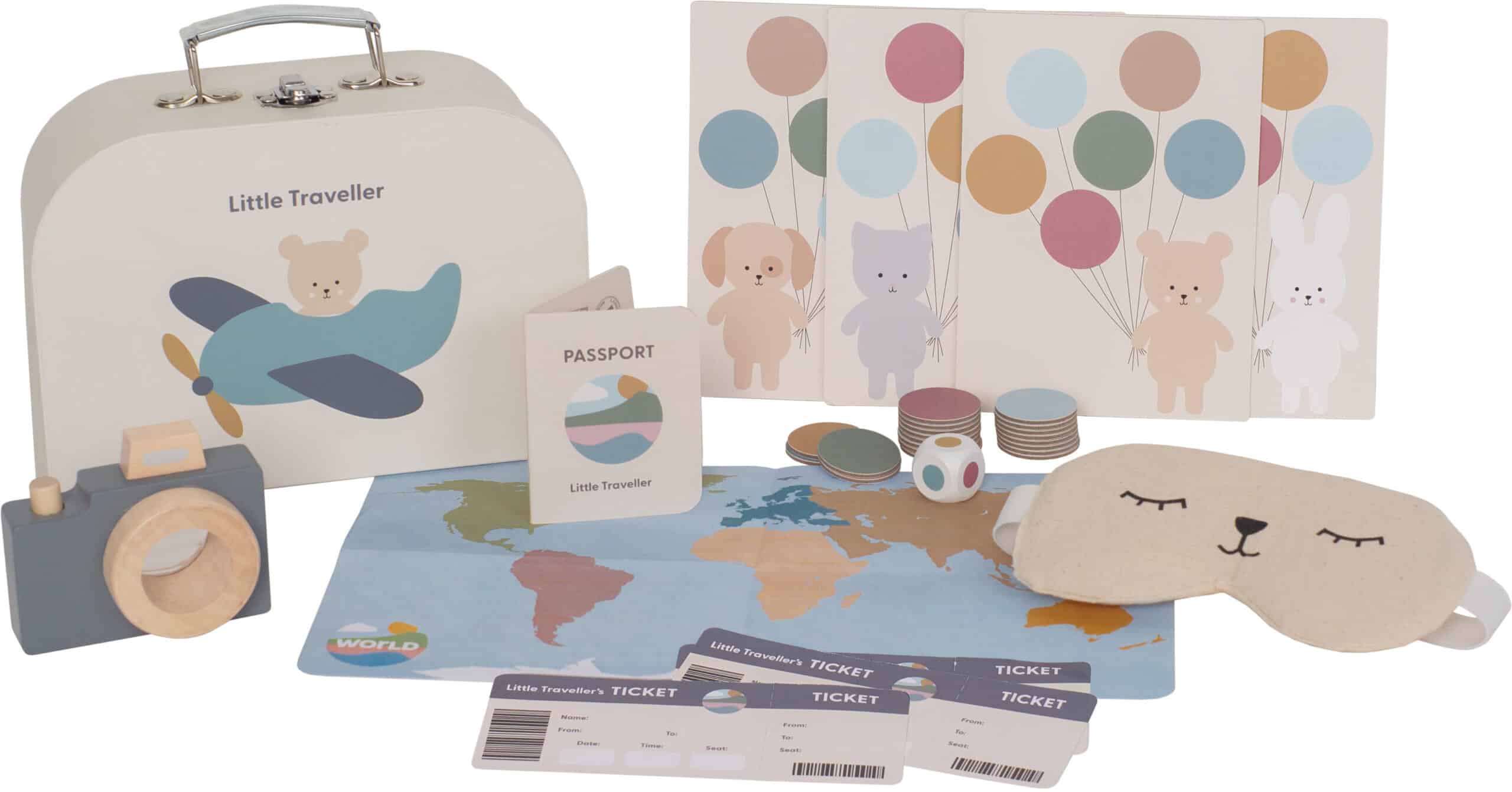 Ora potete finalmente preparare la vostra borsa quando è il momento di andare in vacanza. La nostra borsa contiene l'essenziale per un viaggio lungo o breve. Troverete un passaporto, un biglietto e la vostra macchina fotografica con prisma per fotografare tutto il vostro viaggio. Se il viaggio è lungo, c'è una mascherina per gli occhi per addormentarsi facilmente e svegliarsi in tempo per l'arrivo. C'è anche una mappa per vedere dove si sta andando e, se ci si annoia, si può giocare con gli amici a un divertente gioco di palloncini lungo il percorso. Per giocare, si tirano i dadi e si posiziona la tessera del colore giusto sul palloncino del colore corrispondente. Il primo che riempie tutte le tessere con i palloncini vince. Buon divertimento durante il viaggio! 1 borsa ""Piccolo Viaggiatore"" – 1 passaporto – 3 biglietti – 1 macchina fotografica in legno con prisma – 1 maschera per gli occhi in tessuto – 1 mappa del mondo (carta patinata) – oca da viaggio con 4 pezzi di gioco e 24 segnalini palloncino – 1 dado".