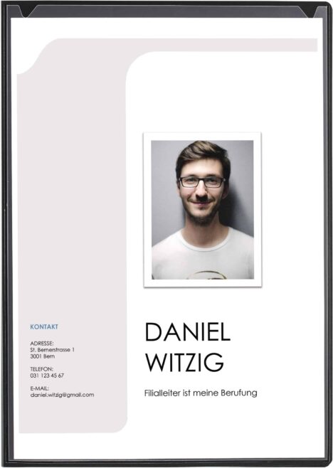 La cartella applicativa in resistente materiale KolmaFlex garantisce un'impressione attraente e duratura. Fino a 25 fogli (80 g/m2) possono essere conservati in modo sicuro nella guida a clip integrata. Grazie alla tasca saldata sul lato anteriore, è possibile stupire a prima vista con un frontespizio.