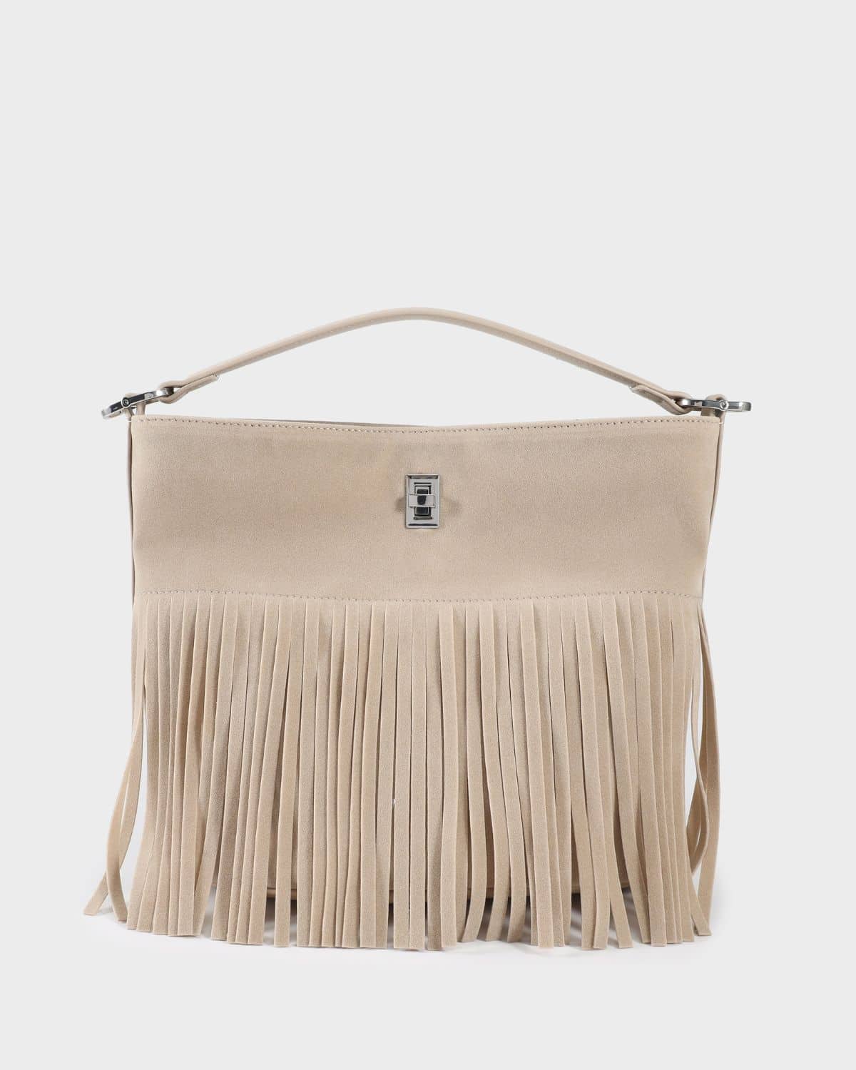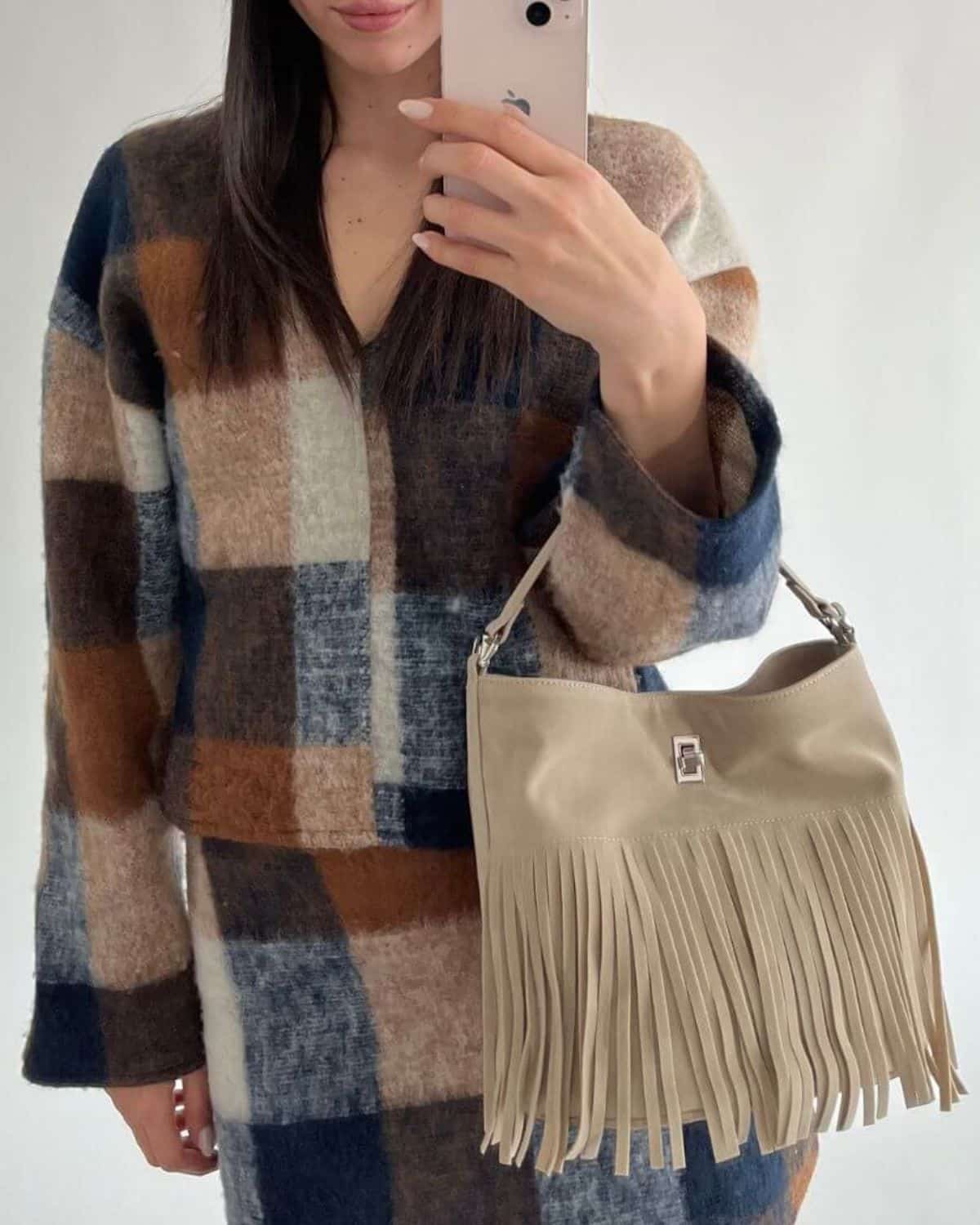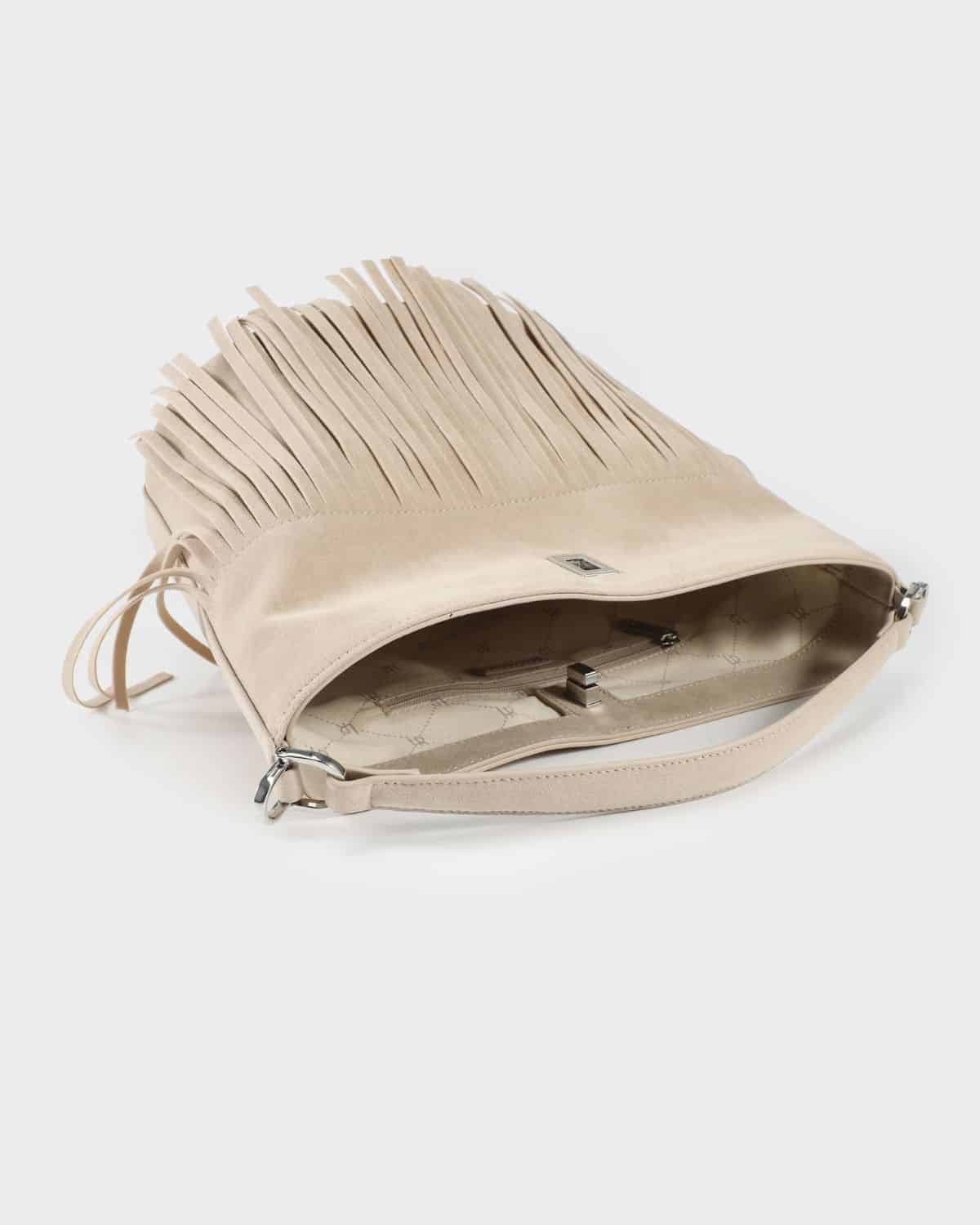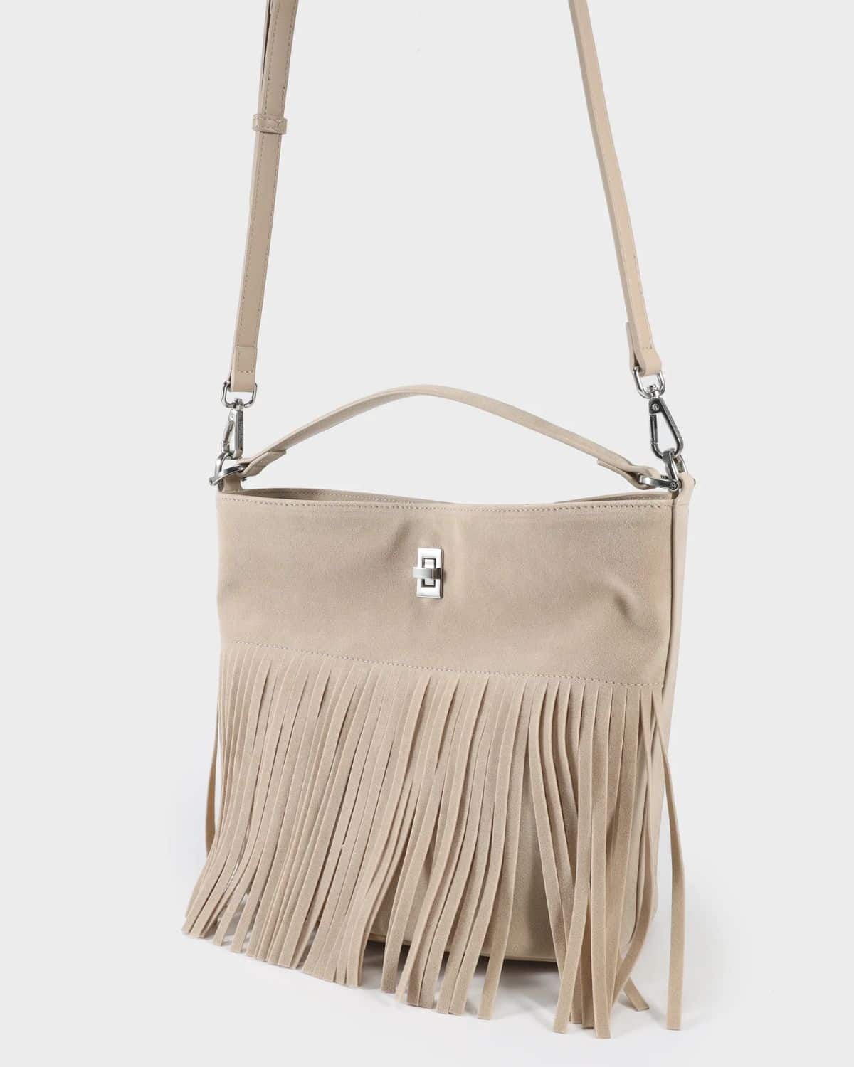 La borsa a secchiello RILEY di Label Rose è l’accessorio ideale per chi ama uno stile boho-chic raffinato e contemporaneo. Realizzata in finta pelle scamosciata abbinata a similpelle, si distingue per il suo design ricercato e per le lunghe frange decorative frontali, che donano movimento, personalità e un tocco fashion unico.