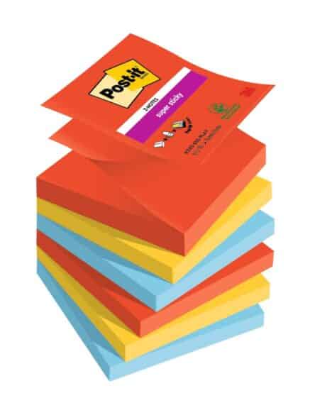 Con piegatura a Z, Super Sticky si attacca meglio e quindi pi? a lungo, con adesivo rinforzato e carta pi? spessa, blocchetti da 90 fogli, colori: rosso, giallo, blu mediterraneo.