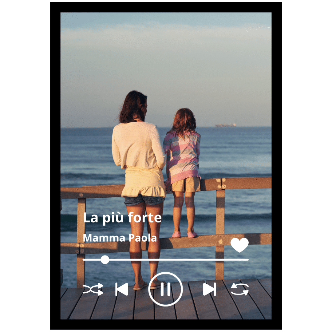 - Personalizzazione completa: Oltre alla foto centrale, puoi personalizzare i testi, come il titolo della “canzone” e l’artista. Questi dettagli rendono il poster perfetto per celebrare ricorrenze come compleanni, anniversari, o semplicemente per esprimere un pensiero speciale dedicato a una persona cara. Ad esempio, puoi intitolare la canzone con frasi come “La piรน forte” e il nome dell’artista potrebbe essere “Mamma Paola”, come nell’esempio dell’immagine.
