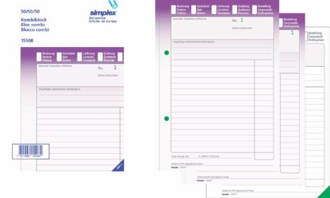 Il blocco combinato SIMPLEX può essere utilizzato per bollettini d'ordine, bolle di consegna, ricevute o persino fatture, rappresentando così una soluzione adatta a un'ampia gamma di lavori.