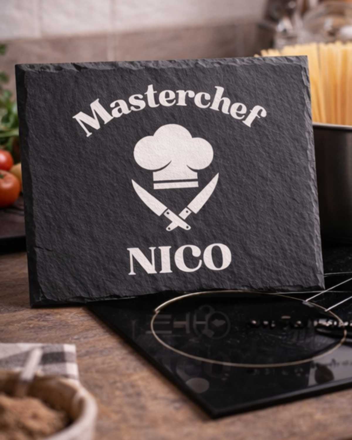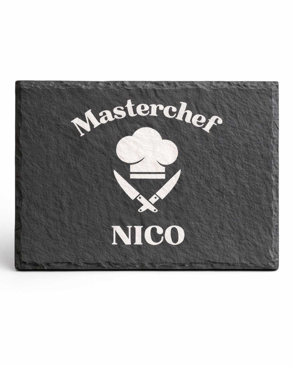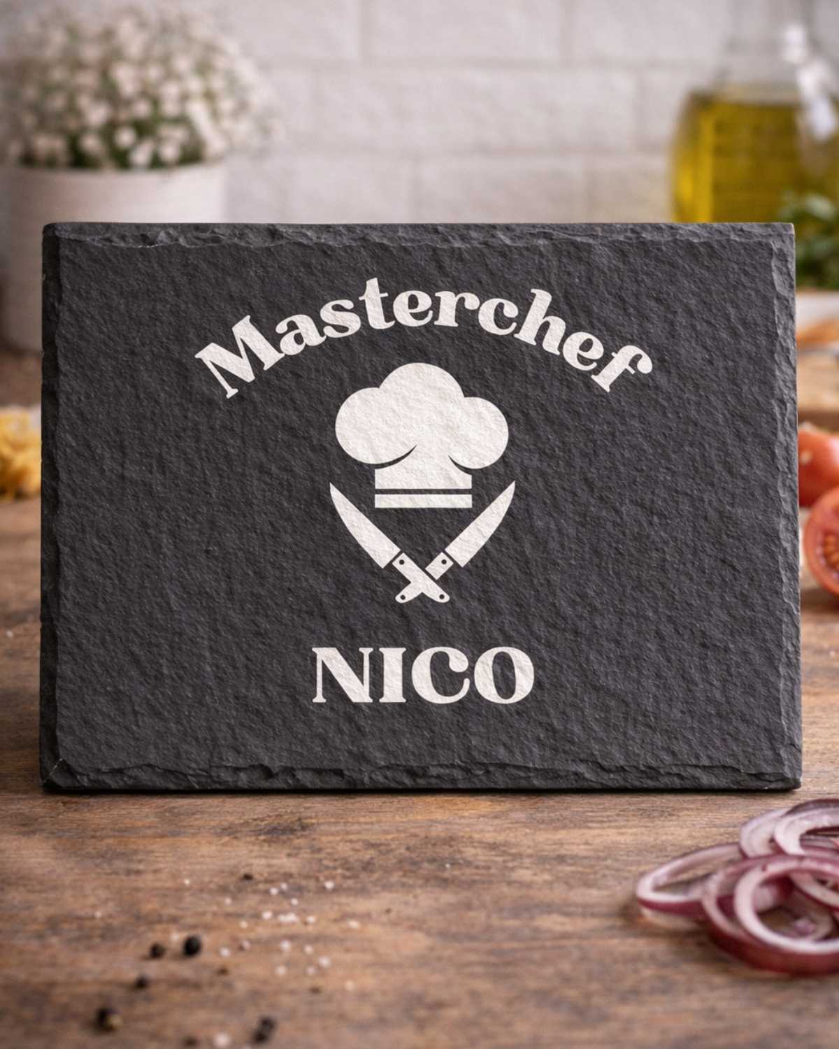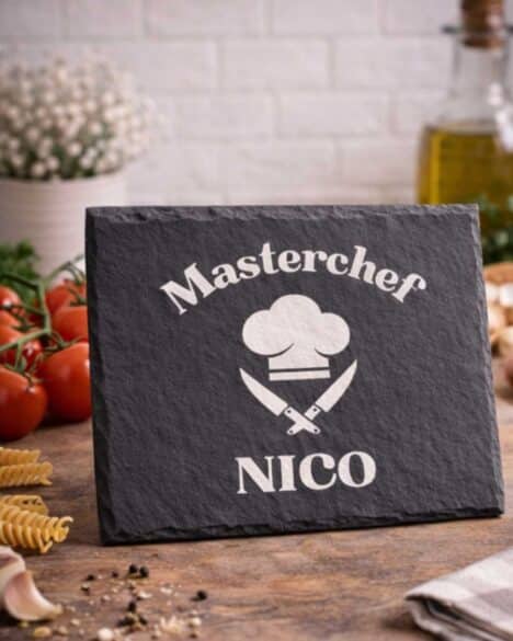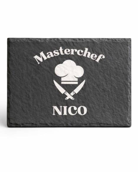 Fai sentire chiunque un vero chef con il nostro tagliere in ardesia personalizzato a tema โMasterchefโ. Elegante, resistente e dallo stile deciso, รจ perfetto come regalo per appassionati di cucina, grigliatori esperti o semplicemente per chi ama cucinare con stile.